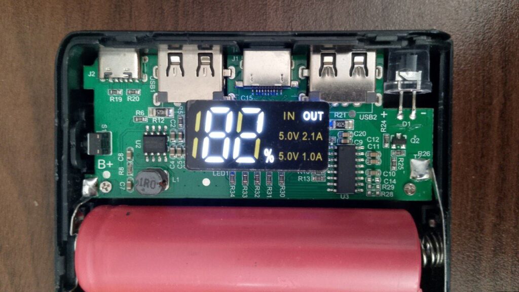 Por ultimo, Los componentes del dispositivo son los que se esperaría de un banco de baterías, pero a diferencia de los bancos de baterías para laptops, este modulo no cuenta con control de temperatura, ni un control individual para cada una de las ocho celdas que puede alojar. Esto es peligroso puesto que es incapaz de conocer la salud de cada celda, inyectándoles energía en el mismo ciclo de carga a todas, lo que las degrada y daña a largo plazo, ademas de poder causar riesgos de sobre carga o sobre descarga, pues las baterías de ion litio, a diferencia de las de polímero de litio, no cuentan con un circuito limitador que las proteja.